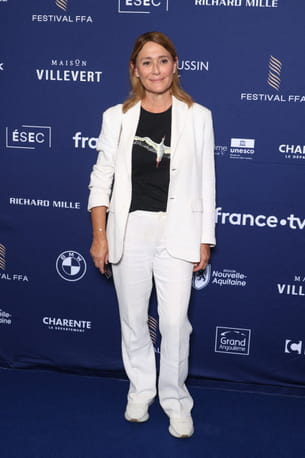 Pour la cérémonie d'ouverture du festival du film d'Angoulême, Daniela Lumbroso a choisi une silhouette à la fois élégante et décontractée. Elle portait un costume blanc, pièce forte et intemporelle, qui illuminait le tapis bleu. Sous la veste, elle avait glissé un t-shirt noir orné d'un imprimé graphique, apportant une touche moderne et décalée à l'ensemble. Ses baskets blanches renforçaient ce registre casual chic, loin de l'austérité d'un look trop strict. Avec ce mélange maîtrisé de classicisme et de confort, elle affichait une allure maitrisée et contemporaine.