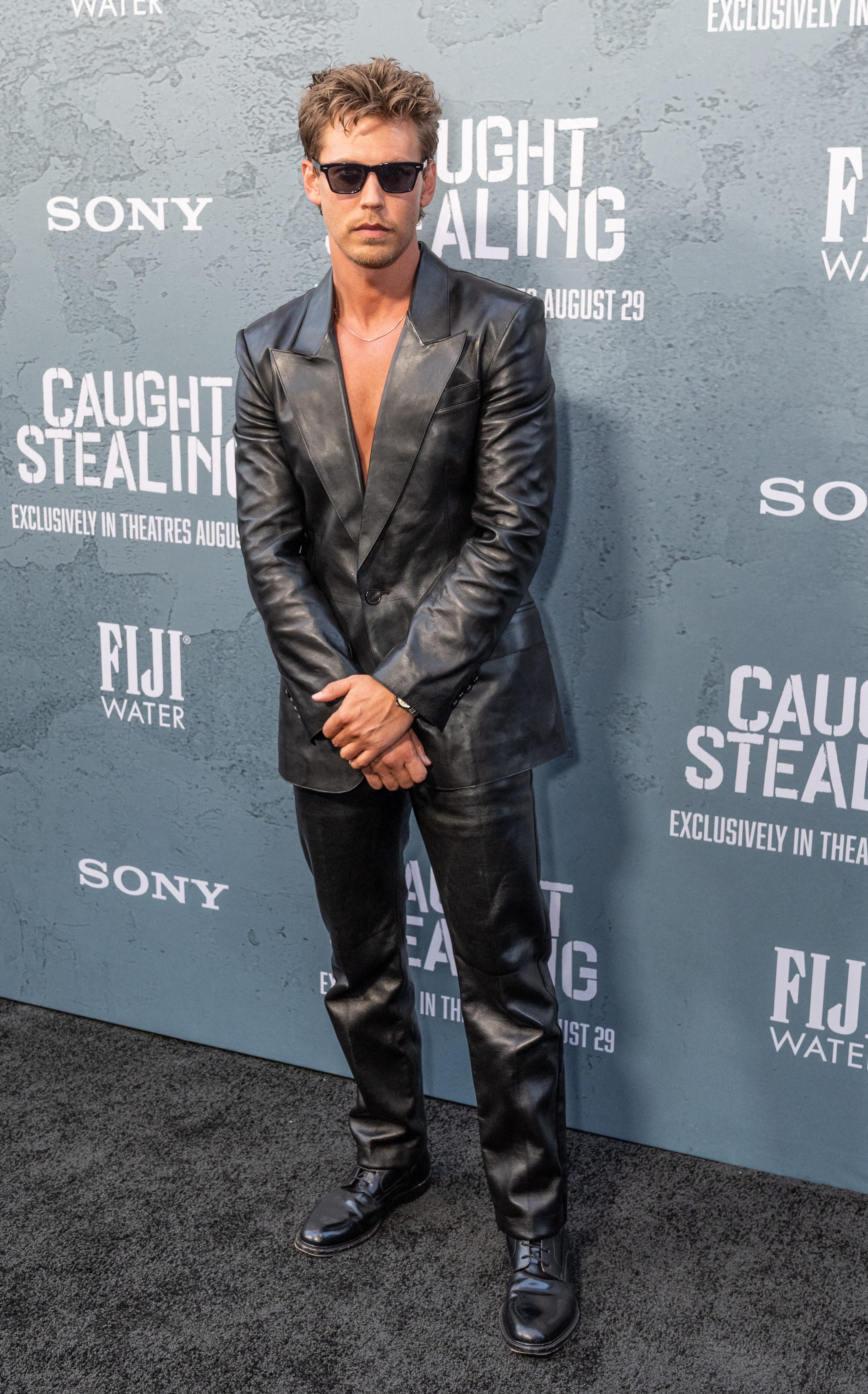 Lui aussi présent à la première du film Pris au piège, Austin Butler y a fait une apparition remarquée grâce à son look classe à souhait. En effet, il portait un ensemble audacieux et monochrome en cuir. Il avait opté pour un costume noir, composé d'une veste de blazer à revers classique et d'un pantalon assorti. Le costume, d'un noir brillant, dégageait une allure rock et sophistiquée. Il n'avait rien mis sous sa veste, la laissant ouverte pour une touche sexy. Son look était accessoirisé d'une paire de lunettes de soleil et d'un collier fin.