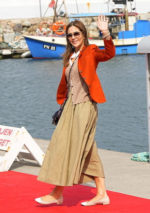 Toujours en croisière estivale, Mary de Danemark enchaîne les apparitions et le moins que l'on puisse dire est qu'elle maîtrise l'art de s'habiller pour chaque occasion. Le 27 août dernier, elle est apparue au port d'Østerby et portait une tenue estivale composée d'une jupe midi fluide de couleur beige, surmontée d'une veste originale. Le point fort de cet ensemble était donc cette veste courte et vive, d'un orange intense. Des ballerines plates et des lunettes de soleil complétaient ce look parfait pour une balade en bord de mer.