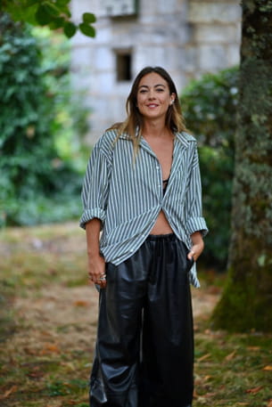 Constance Labbé a fait le choix d'un look audacieux et décontracté, parfait pour l'événement. L'actrice portait une chemise à larges rayures vertes et blanches, qu'elle avait laissée ouverte sur un crop top noir. Elle avait attaché sa chemise à la taille, créant une silhouette moderne qui mettait en valeur son ventre. Pour le bas, elle avait opté pour un pantalon large en simili-cuir noir. Le contraste des matières entre la chemise en coton et le pantalon brillant créait un effet à la fois rock et sophistiqué. Pour compléter sa tenue, Constance Labbé avait choisi des bijoux discrets, laissant l'originalité de sa tenue faire le reste.
