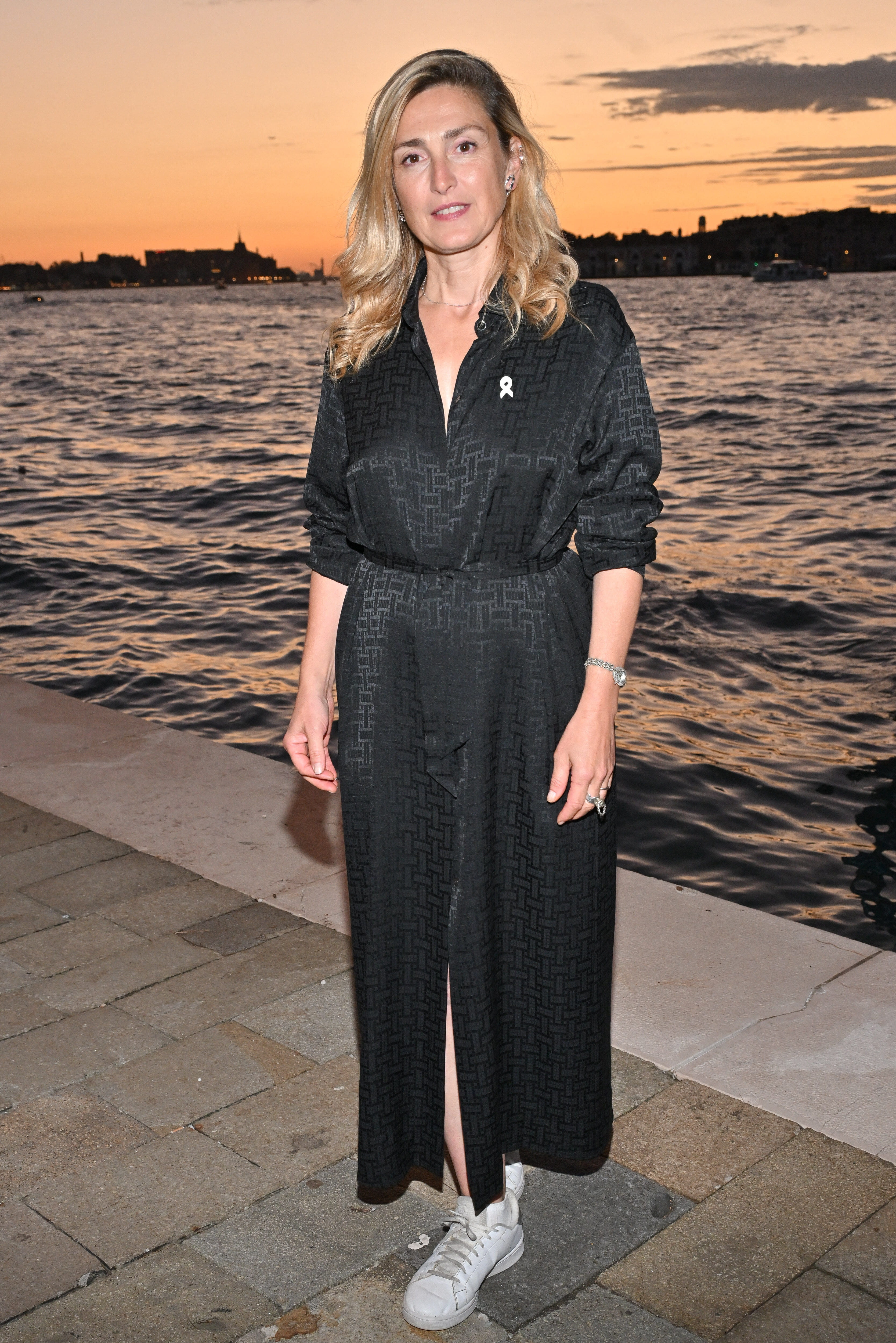 À la Mostra de Venise, Julie Gayet a fait une apparition remarquée en choisissant une tenue à la fois chic et confortable. L'actrice a opté pour une robe longue noire à motifs géométriques en relief , accompagnée d'un détail surprenant qui a fait l'unanimité : une paire de baskets blanches. Ce choix audacieux cassait les codes du tapis rouge, tout en restant dans le registre de l'élégance. Cette robe-portefeuille ceinturée à la taille, soulignait sa silhouette avec une touche de sophistication. Le contraste entre la robe et les chaussures a bien prouvé que la mode n'est pas toujours synonyme de glamour absolu.