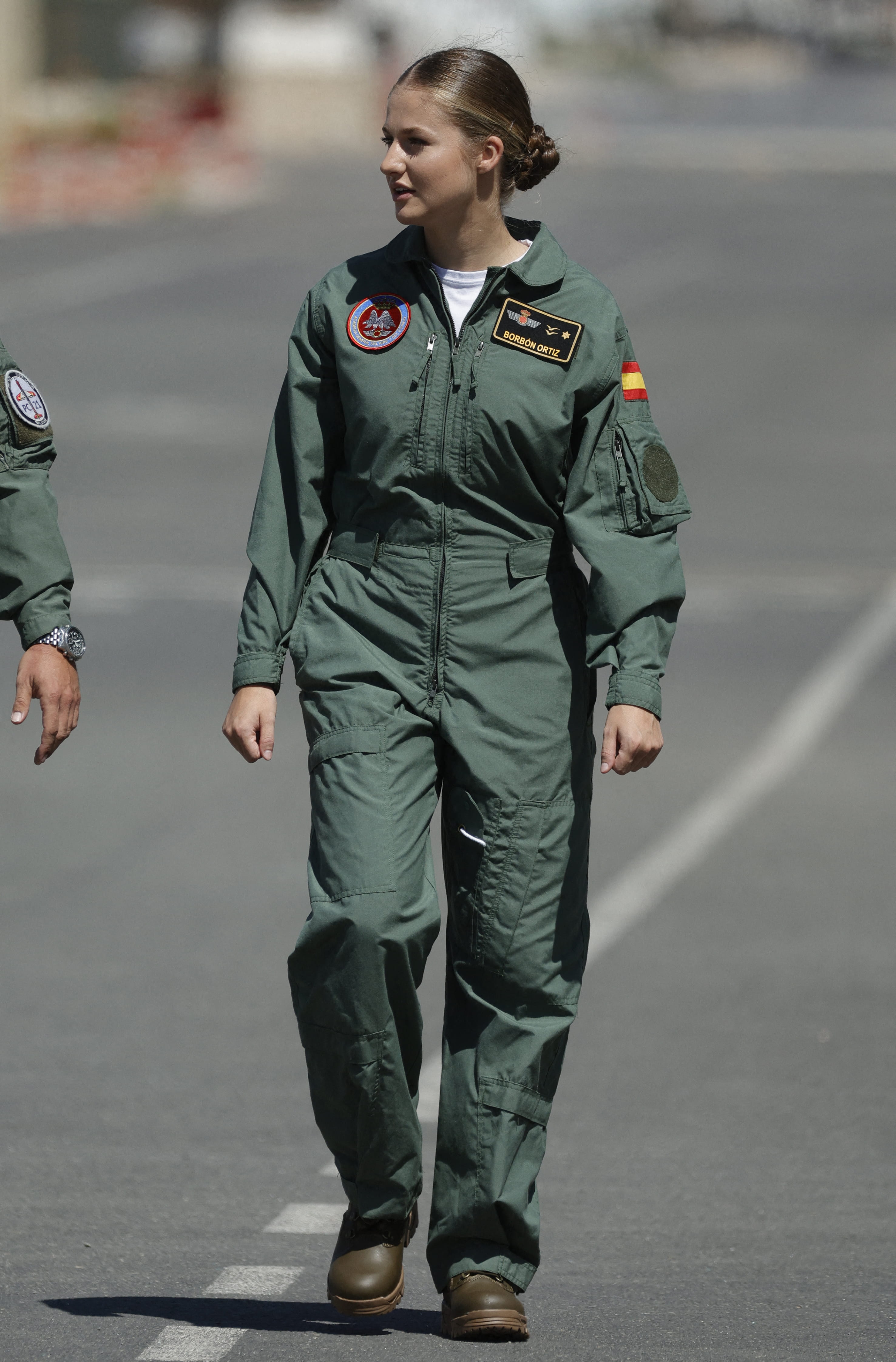 Lors de sa dernière apparition, la princesse Leonor d'Espagne a adopté un look sobre en parfaite adéquation avec son statut militaire. Elle portait une combinaison de vol vert kaki, ornée d'écussons officiels et de son nom brodé, qui soulignait son engagement dans la formation au sein des forces armées. La tenue, pratique et ajustée, était complétée par des rangers marron. Ses cheveux soigneusement attachés en un chignon bas mettaient en valeur sa beauté naturelle. Avec ce look, Leonor avait su allier discipline militaire et prestance princière.