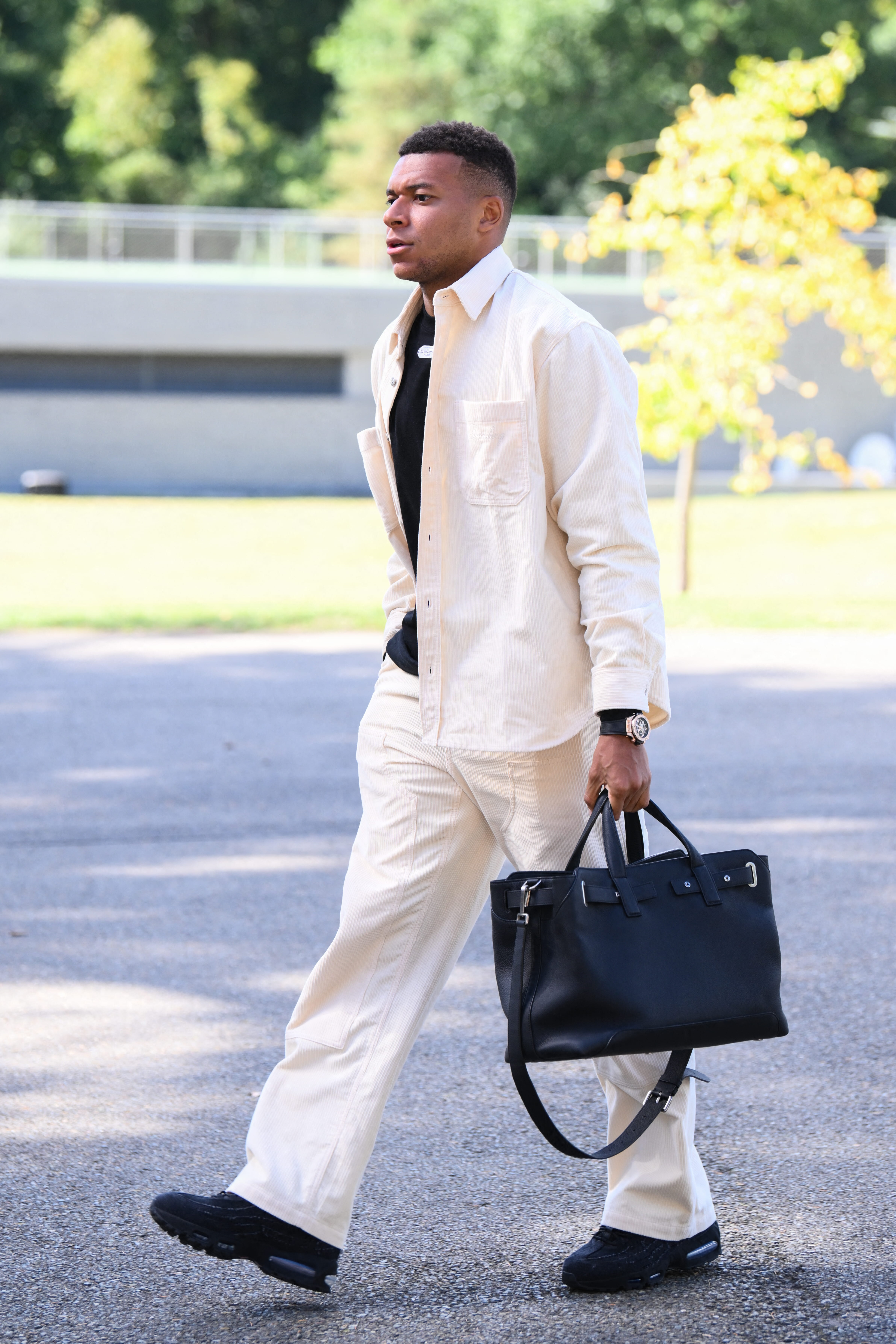 Kylian Mbappé a également fait sa rentrée au centre d'entraînement de Clairefontaine. Les photographes étaient évidemment présents pour capturer son look chic et décontracté. En effet, le jeune homme portait un ensemble de couleur beige, composé d'un pantalon large et d'une surchemise en velours côtelé, ultra-tendance en cette rentrée. Pour aller avec son t-shirt noir, le joueur a craqué pour un sac en cuir et une paire de baskets assortis. Dans cette tenue, Kylian Mbappé a prouvé que la simplicité et le confort ont tout bon !