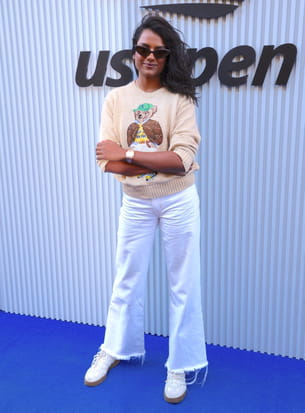 Pour assister à l'US Open, Simone Ashley a été vue dans un style chic et accessible. L'actrice portait un pull en maille de couleur crème orné d'un motif d'ours en peluche qui lui donnait une allure à la fois mignonne et décalée. Elle a accompagné ce pull d'un jean blanc large : un look simple mais incontournable pour la mi-saison. L'actrice a aussi rehaussé sa tenue d'une paire de baskets blanches à semelle épaisse, qui ajoutaient une touche de modernité à l'ensemble. Côté accessoires, elle a choisi de porter une montre et des lunettes de soleil à monture fine. Une vraie star !
