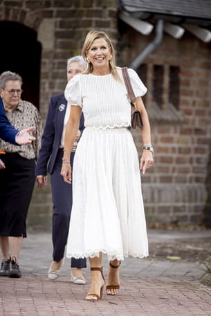 En déplacement officiel à Veghel, la reine Maxima des Pays-Bas a opté, une fois encore, pour une tenue d'été. La souveraine semble avoir du mal à dire adieu à la saison et cela s'en ressent dans les différents looks qu'elle propose. Ici, elle a décidé d'oser une pièce tendance de l'été : le crop top. À 54 ans, Máxima des Pays-Bas a donc sorti de son dressing royal un crop top blanc à manches bouffantes. Pour l'accompagner, elle a jeté son dévolu sur une jupe taille haute en broderie anglaise qui arrivait à mi-mollet. Une réussite comme d'habitude !