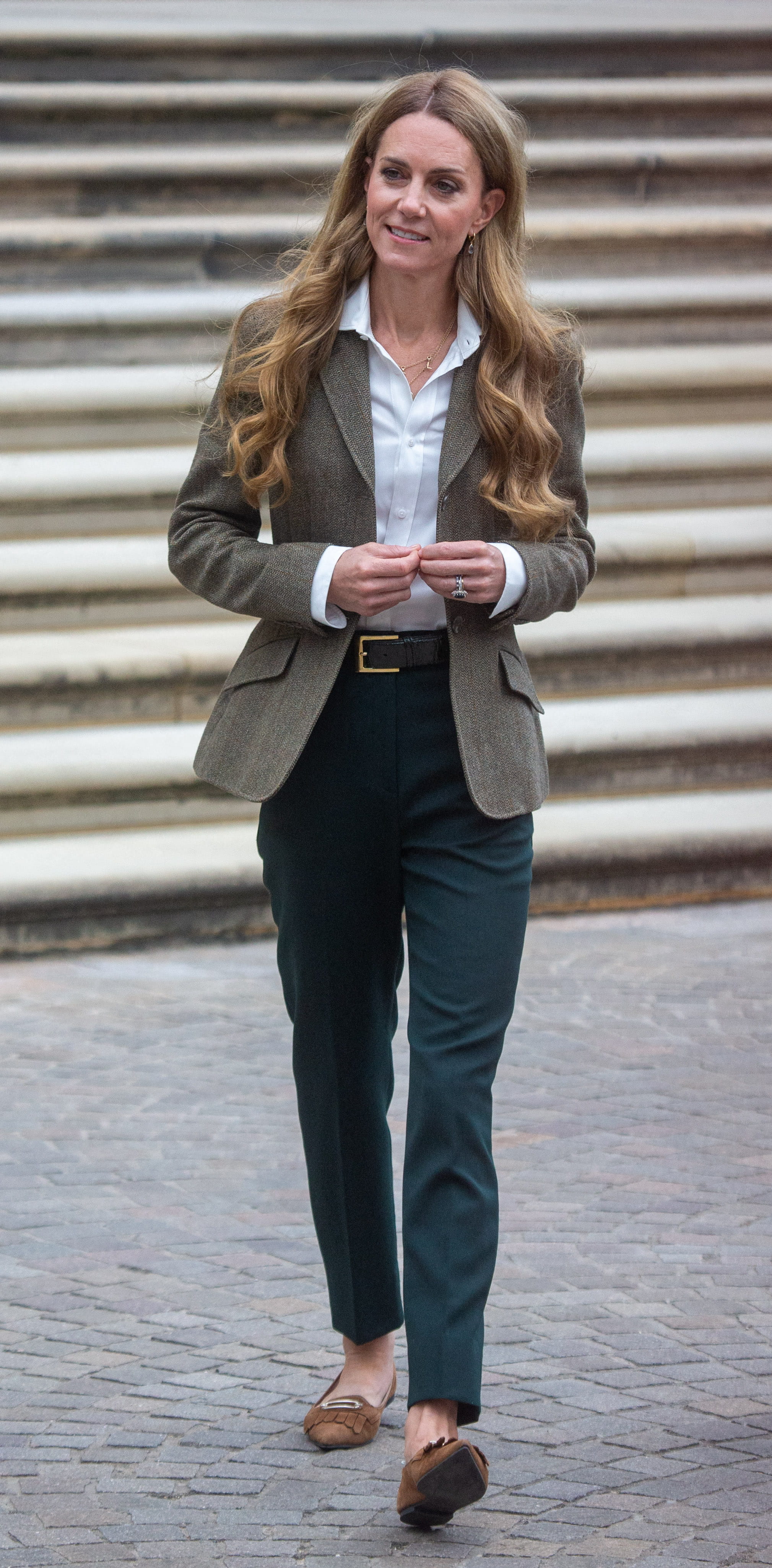 Lors de son dernier déplacement, Kate Middleton a fait sensation comme à son habitude. La princesse de Galles a choisi de dévoiler une tenue automnale des plus inspirantes. Elle arborait en effet, un look élégant et décontracté, parfait pour la mi-saison. Elle portait un blazer en tweed marron qui s'harmonisait avec un pantalon ajusté de couleur vert forêt et une chemise blanche boutonnée. L'ensemble était souligné par une fine ceinture en cuir noir. Aux pieds, elle a choisi des ballerines en daim marron, la pièce phare de l'automne sans aucun doute.