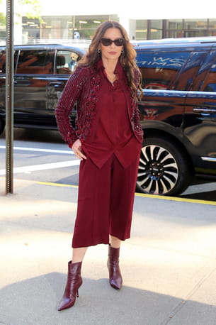 Catherine Zeta-Jones a été photographiée dans un look monochrome, élégant et sophistiqué. Elle a opté pour un ensemble de couleur bordeaux composé d'un pantalon fluide, d'une blouse et d'une veste assortie. La veste courte, est agrémentée de broderies délicates et brillantes qui ajoutaient une touche de glamour à sa tenue. Des bottines à talons et à bouts pointus venaient parfaire le look. Des lunettes de soleil, une paire de boucles d'oreilles pendantes et un collier en or s'ajoutaient à son allure ultra-féminine.
