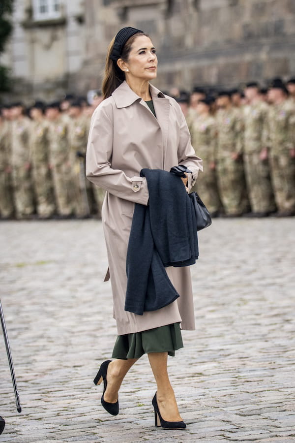 Mary de Danemark a assisté à la cérémonie annuelle d'hommage au drapeau danois qui se tenait à Copenhague le 5 septembre dernier. Un événement pour lequel la reine avait revêtu un outfit parfait pour la mi-saison. Elle avait en effet conjugué une robe vert foncé à un simple trench beige arrivant sous le genou. Pour accessoiriser l'ensemble, la tête couronnée a choisi d'arborer un épais bandeau dans les cheveux, une paire de gants en cuir, un mini sac noir ainsi que des escarpins en daim aussi élégants que féminins.