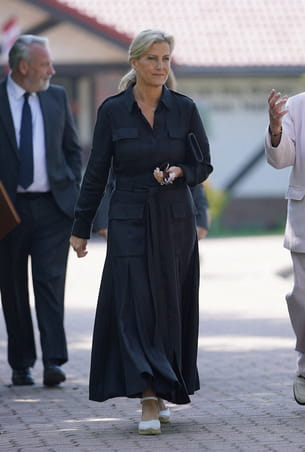 Sophie d'Edimbourg a participé à un nouvel événement à Spure Meadows, le 5 septembre dernier, dans le cadre de son séjour au Canada. Elle a alors ébahi l'assistance en glissant sa silhouette dans une robe chemise bleu marine qui lui allait à ravir. La pièce en question comportait plusieurs poches plaquées, une ceinture nouée autour de la taille ainsi qu'une longueur maxi. Côté accessoires, la duchesse optait pour des espadrilles blanches et pour une pochette glissée sous son bras. En un mot : ravissante !