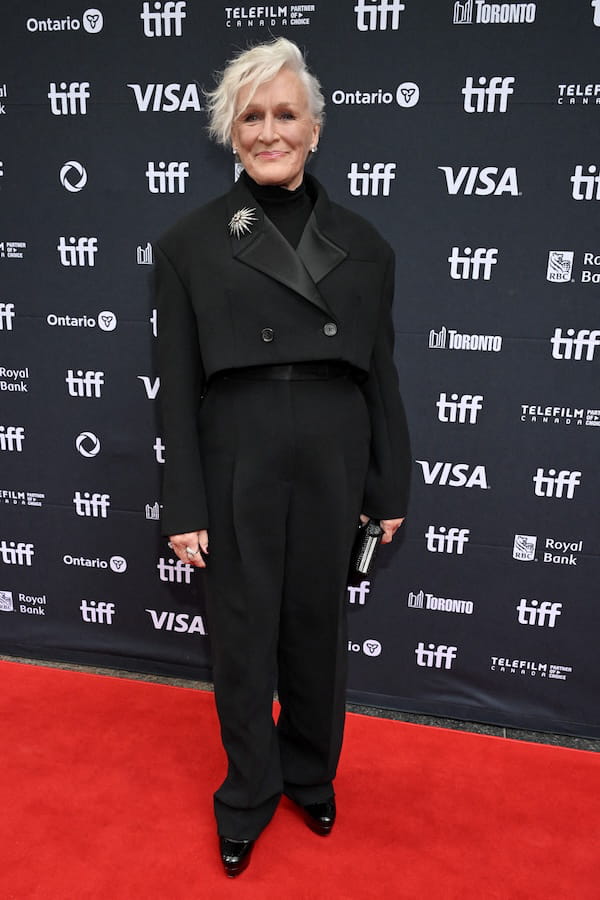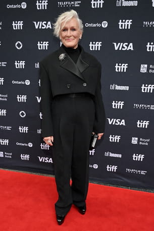 L'actrice américaine Glenn Close a une nouvelle fois prouvé son goût prononcé pour la mode lors de la projection du film Wake Up Dead Man au Festival du film international de Toronto le 6 septembre dernier. Pour cette occasion, elle avait opté pour un ensemble de costume à la teinte noire. La septuagénaire portait un pantalon taille haute à la coupe ample, un top côtelé au col montant ainsi qu'une veste de blazer ultra courte dotée d'un double boutonnage. Elle a ensuite misé sur une minaudière brillante, des talons à plateformes et une broche argentée pour compléter ce look.