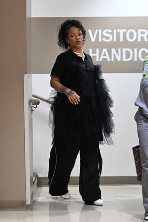 Toujours ultra lookée, Rihanna a été photographiée dans une silhouette tout en noir alors qu'elle se rendait à un rendez-vous médical ce mercredi 10 septembre. Celle qui attend son troisième enfant était ainsi parée d'un tee-shirt au col ouvert, agrémenté de pièces en tulle façon tutu de chaque côté, et d'un pantalon de survêtement large se caractérisant par un liseré blanc sur le côté. La chanteuse avait chaussé des baskets à crampons Puma blanches pour matcher avec ce dernier et avait habillé son cou de multiples colliers en or.