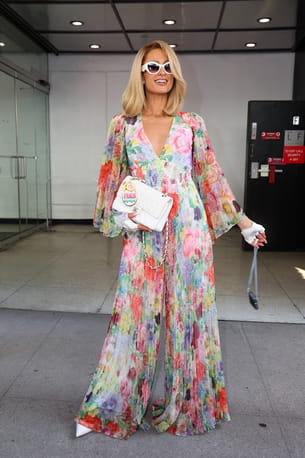 Paris Hilton s'est rendue sur le plateau de l'émission The Drew Barrymore Show à New York ce mardi 9 septembre. Pour cette sortie, la business woman portait avec une élégance folle une combinaison plissée à fleurs multicolores. Il s'agissait d'un modèle de la marque Alice + Olivia qui se caractérise par un décolleté plongeant, des manches larges, une taille marquée et un pantalon ultra large et fluide. Une tenue fraîche qu'elle a complétée d'accessoires immaculés : un sac Timeless de chez Chanel, des escarpins pointus et des lunettes oversize.
