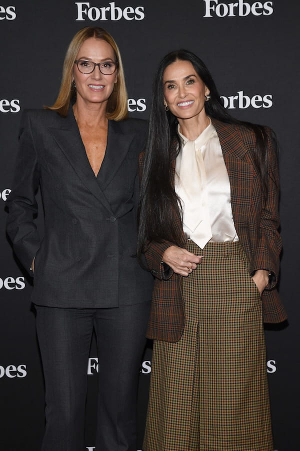 C'est dans un look au style très pointu que Demi Moore a posé devant le photocall de la soirée Forbes Power Women's Summit 2025. Immortalisée aux côtés de Sherry Phillips, elle a mis les carreaux à l'honneur ce mercredi 10 septembre. Un imprimé automnal que la star a pris soin d'apposer sur sa veste de blazer oversize et sur sa jupe-pantalon large en version pied-de-poule. Elle avait également enfilé un chemisier en soie avec une sorte de cravate intégrée pour rehausser la silhouette. Le clou du spectacle ? Ses épaisses créoles et ses bagues dorées.