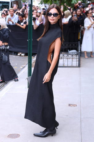 Présente au défilé printemps 2026 de Calvin Klein, ce vendredi 12 septembre, Emily Ratajkowski a mis le paquet niveau look. Le célèbre mannequin a littéralement captivé l'attention dans une robe dont la coupe sculpturale mettait en valeur sa silhouette. L'atout majeur de cette pièce ? Ses larges ouvertures sur le côté accompagnées d'un col montant et d'une longueur maxi avec une fente arrière. Elle finalisait cette tenue à la fois chic et minimaliste avec des chaussures en cuir ultra pointues et des lunettes de soleil ovales.