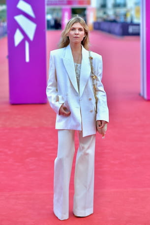 Le 13 septembre dernier, Clémence Poesy assistait à la cérémonie de clôture du Festival du film américain de Deauville dans une jolie silhouette immaculée. Elle était vêtue d'un ensemble de costume composé d'une veste de blazer oversize qui surmontait un débardeur en dentelle et un pantalon fluide assez long pour cacher ses chaussures. Son astuce pour twister son look 100% blanc ? Se parer d'accessoires dorés. L'actrice française a donc misé sur un long sautoir et sur un sac à main en forme de coquillage agrémenté de détails en or sur la bandoulière.