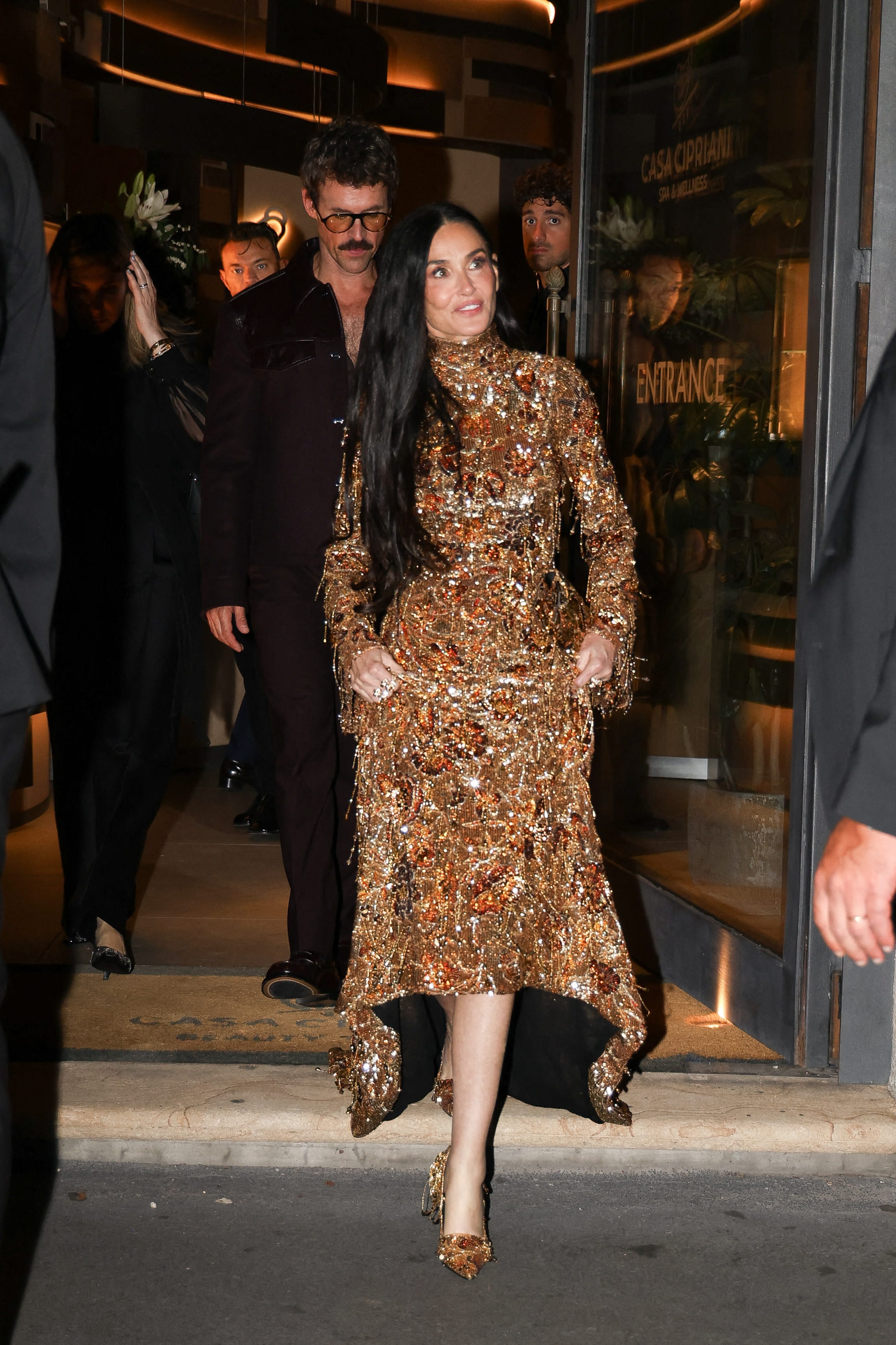 Demi Moore a fait une apparition éblouissante, vêtue d'une robe de soirée qui était une véritable œuvre d'art. Cette robe longue et dorée était richement ornée de perles, de franges et de sequins dans des tons de bronze et de cuivre, créant un effet scintillant à tomber. La robe, dotée de manches longues et d'un col haut, présentait une coupe asymétrique et évasée sur le bas. Pour parfaire son look, elle portait des escarpins assortis et avait choisi une coiffure simple, laissant ses longs cheveux noirs lisses tomber sur ses épaules.