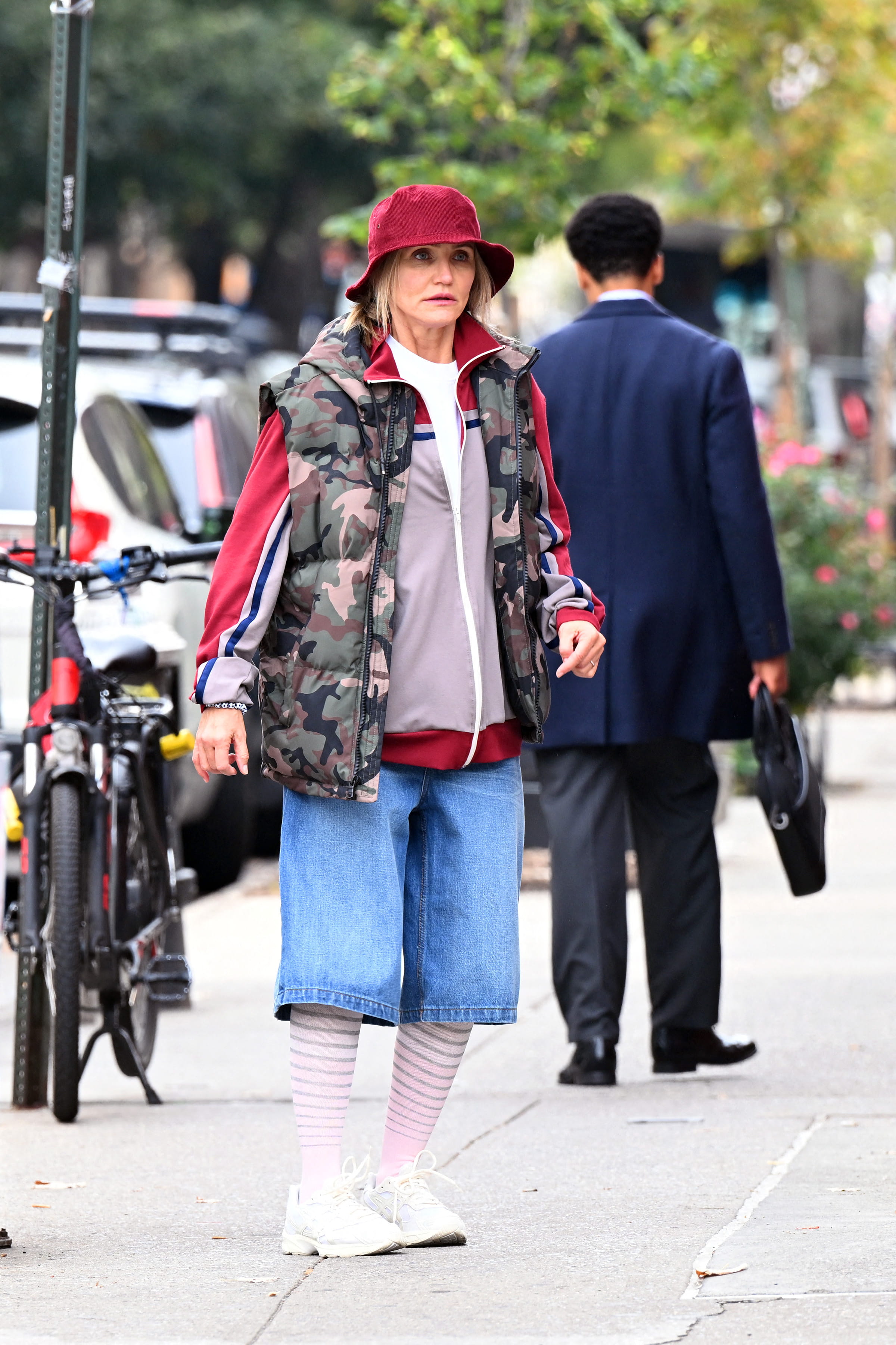 Lors de son premier jour de tournage de son film Bad Day sur Netflix, Cameron Diaz était tout simplement métamorphosée. Elle affichait un look de rue décontracté et audacieux. L'actrice portait une superposition de vêtements qui n'avait rien à voir les uns avec les autres. Au programme : un T-shirt blanc, une veste de survêtement rouge et bordeaux, et un gilet sans manches à imprimé camouflage. Le bas se composait d'un bermuda en jean oversize, porté avec des chaussettes rayées roses et des baskets blanches. Un bob rouge, assorti à sa veste, complétait cette tenue éclectique et très originale.