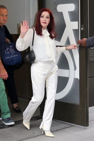 À New York, Priscilla Presley portait un ensemble monochrome blanc cassé absolument somptueux. Son haut était composé d'une blouse fluide en satin et à col lavallière. Le bas est un pantalon de costume assorti, à la coupe droite qui épousait parfaitement sa silhouette. Pour accessoiriser sa tenue, elle a misé sur un sac à main noir à chaîne argentée de la marque Prada et des escarpins à bouts pointus de la même couleur que son pantalon. Son style est élégant, intemporel et très sophistiqué. Un sans-faute !