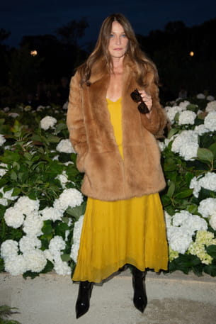 Carla Bruni était présente au défilé Saint Laurent lors de la Fashion Week de Paris et pour l'occasion, elle a craqué pour un look très seventies aux couleurs automnales. Elle portait une longue robe de couleur jaune moutarde à la coupe fluide et tombant jusqu'à mi-mollet, créant une silhouette vaporeuse. Pour contraster avec la légèreté de la robe, elle avait enfilé un manteau court en fausse fourrure marron clair, jeté sur ses épaules, ajoutant une touche de glamour rétro. Aux pieds, elle a jeté son dévolu sur une paire de bottes montantes en cuir noir, brillantes et pointues, qui apportaient une note rock et moderne à l'ensemble.