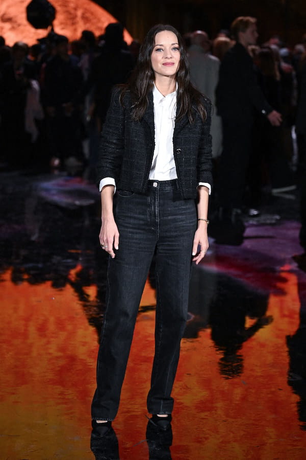 L'élégance était de mise ce lundi 6 octobre à l'occasion du premier défilé Chanel de Matthieu Blazy. Invitée à l'événement, Marion Cotillard a attiré les flashs des photographes dans une tenue sobre qui retranscrivait à merveille le style Chanel. Sa silhouette se composait ainsi d'une chemise blanche boutonnée jusqu'en haut, d'un jean droit au fini noir délavé et d'une veste en tweed courte. Aux pieds, une paire de talons bi-matière à bout pointu faisait l'affaire pour sublimer l'allure de la comédienne française.