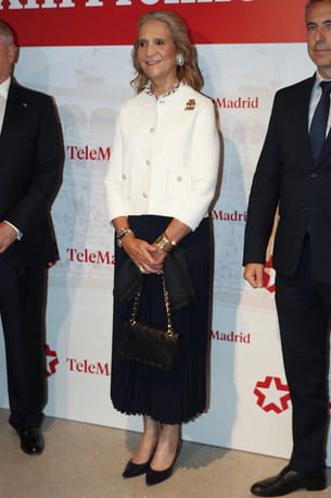 L'infante Elena d'Espagne était présente à la 23e édition des Telemadrid Awards, ce mardi 14 octobre, et elle s'est démarquée par son look bicolore. Pour cette apparition, la sœur aînée du roi Felipe avait associé une jupe plissée noire à une veste blanche dopée de manches raccourcies et de boutons bijoux. Un sac à main matelassé à la chaîne dorée, des escarpins ultra classiques, une broche, des boucles d'oreilles en forme de fleurs et de nombreux bracelets venaient complimenter cette allure sobre très bien maîtrisée.