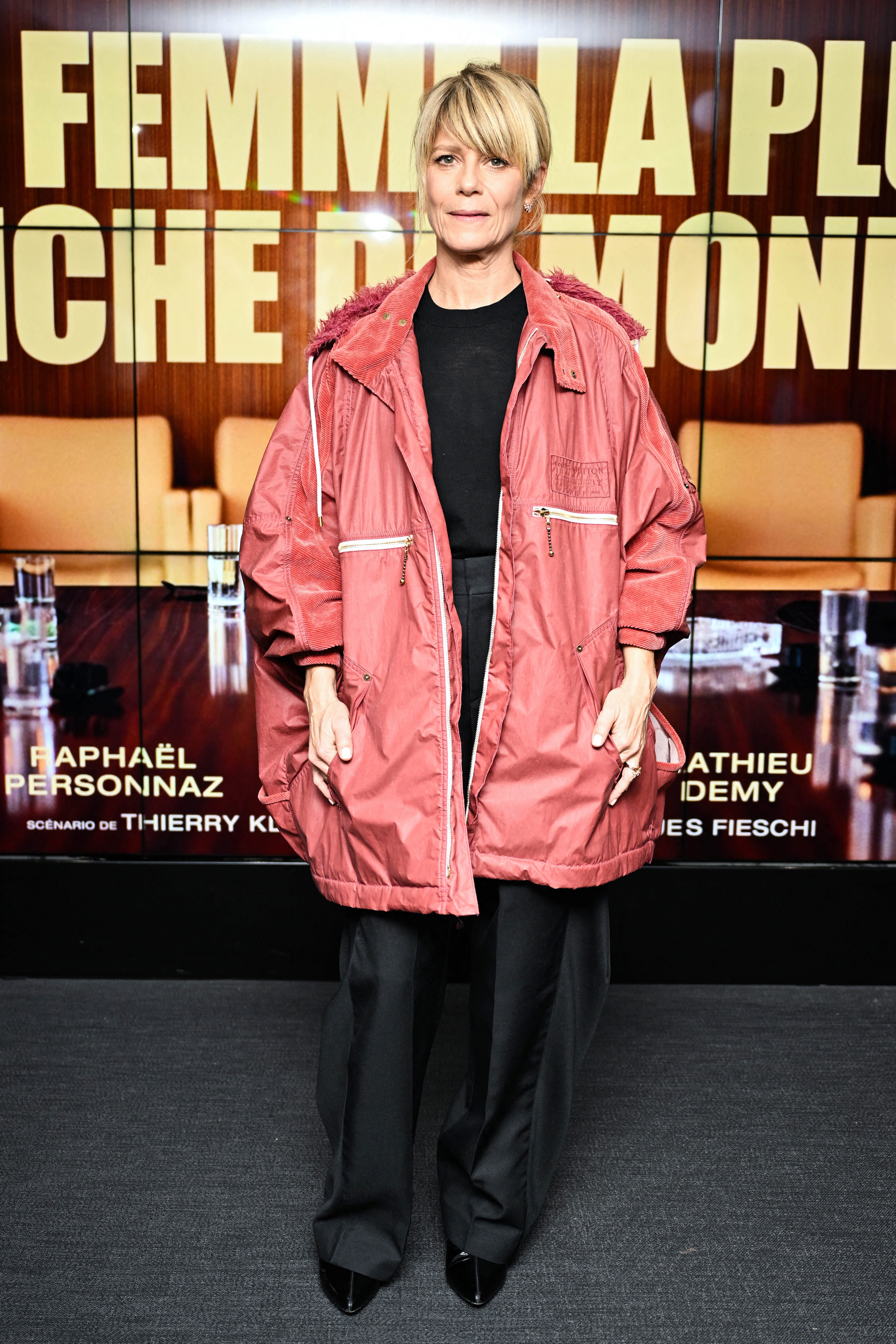 Marina Foïs était également présente à l'événement, mais avait choisi un look plus décontracté et coloré. La pièce dominante de son look était une parka oversize de couleur terracotta, caractérisée par une coupe très ample, des fermetures Éclair et des cordons de serrage, typique d'un style streetwear. Pour contraster avec le volume du manteau, elle a opté pour un ensemble sombre en dessous : un haut noir uni et un pantalon noir de coupe large et fluide, qui tombe élégamment sur ses chaussures noires pointues.