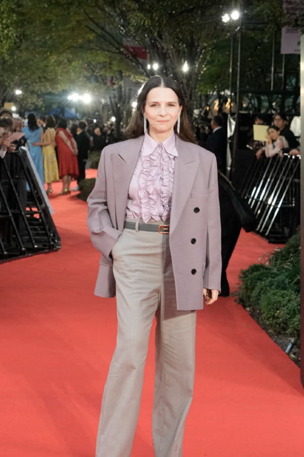 Lors du 38e Tokyo International Film Festival, Juliette Binoche a arboré un look à la fois élégant et audacieux. Elle portait un ensemble dans des tons lavande et gris perle, composé d'un pantalon taille haute fluide et d'une veste oversize à double boutonnage. Sous la veste, elle avait choisi une chemise lavande à col lavallière, ornée de volants délicats sur le devant, ajoutant une touche romantique à sa silhouette. Ce look, à la fois féminin et androgyne, témoignait du style intemporel de l'actrice française.