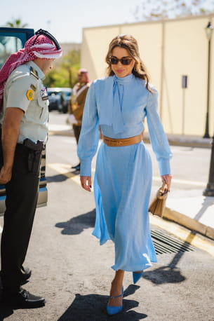 Rania de Jordanie a assisté à la cérémonie d'ouverture de la deuxième session ordinaire du XXe Parlement. Pour cette occasion, elle a affiché un look épuré et sophistiqué en total look bleu ciel. Elle portait une robe longue fluide en soie à manches longues, caractérisée par un col lavallière noué et un crop-top dissimulé sous une large ceinture marron clair qui marquait sa taille. La reine a assorti sa robe à des escarpins à bride de la même couleur puis a accessoirisé sa tenue d'une petite pochette rigide et de lunettes de soleil foncées.