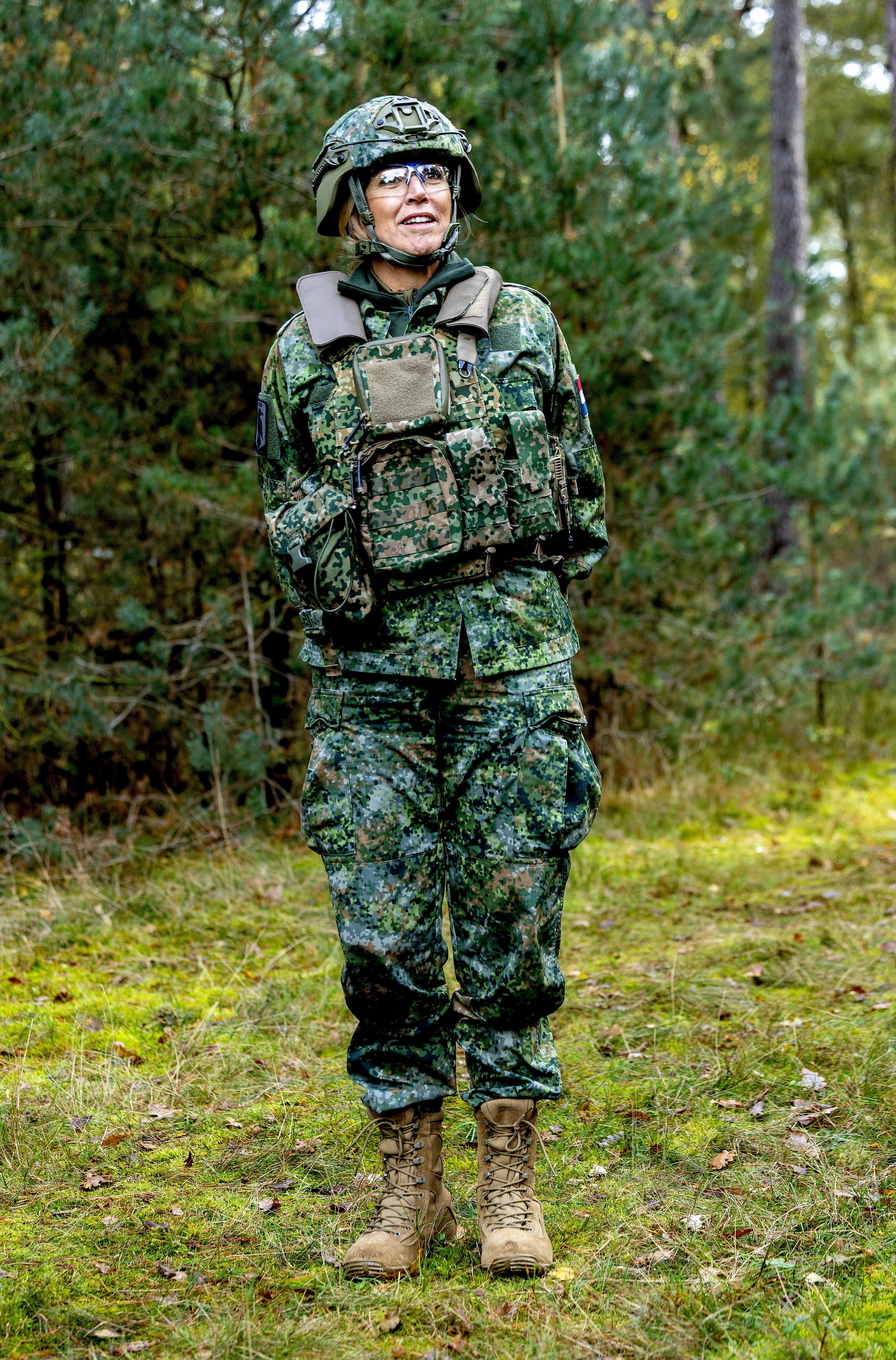 Sur un terrain militaire, la reine Máxima des Pays-Bas enfile un uniforme de soldat