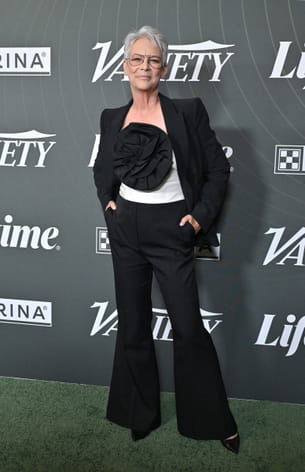 Jamie Lee Curtis était au centre de l'événement prestigieux Variety Power of Women présenté par Lifetime à Los Angeles. L'actrice a misé sur une tenue de soirée monochrome très élégante. En effet, elle a choisi un smoking-pantalon noir, composé d'un pantalon évasé au niveau des jambes et d'un blazer aux épaules structurées, porté ouvert. L'élément central de son look était un haut blanc surmonté d'une grande fleur noire au niveau de la poitrine, ajoutant un détail audacieux à l'ensemble. Ses cheveux courts gris et ses lunettes de vue complétaient ce look chic et audacieux.