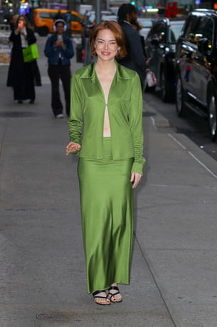 Emma Stone a été photographiée dans les rues de New York en arrivant au Late Show de Stephen Colbert, le 22 octobre dernier. Elle a fait sensation dans un ensemble deux-pièces vert pomme audacieux. L'ensemble était composé d'une jupe longue satinée à la coupée droite, et d'une chemise assortie à manches longues. Elle portait cette chemise ouverte, dévoilant subtilement son ventre et un soutien-gorge discret. Pour ses chaussures, elle a opté pour des sandales plates noires à lanières. Ce look lui allait tout simplement à ravir !