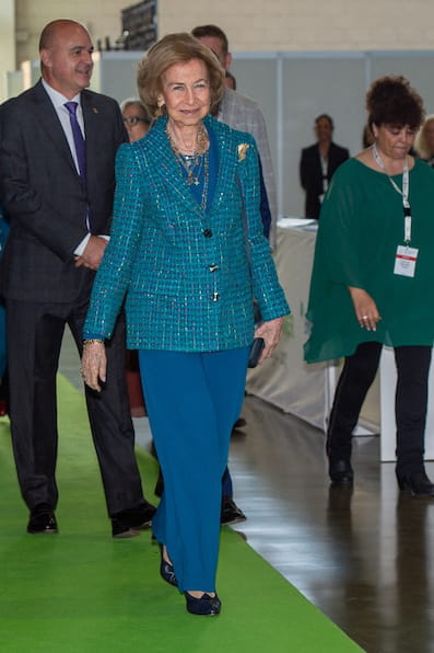 La reine Sofia d'Espagne fait un coup d'éclat mode dans un total look bleu canard