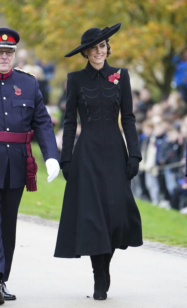 Tenue de commémoration oblige, Kate Middleton a fait une apparition vêtue de noir de la tête aux pieds à l'occasion de la cérémonie du 11 novembre en l'honneur des soldats tombés au combat. Elle brillait d'une élégance austère dans un manteau officier signé Catherine Walker, avec une taille marquée, un col chemise et des broderies ton sur ton. La princesse de Galles arborait également un chapeau en feutre noir avec large bord et nœud ainsi que des gants en laine. À ses pieds : des bottes Gianvito Rossi en daim noir.