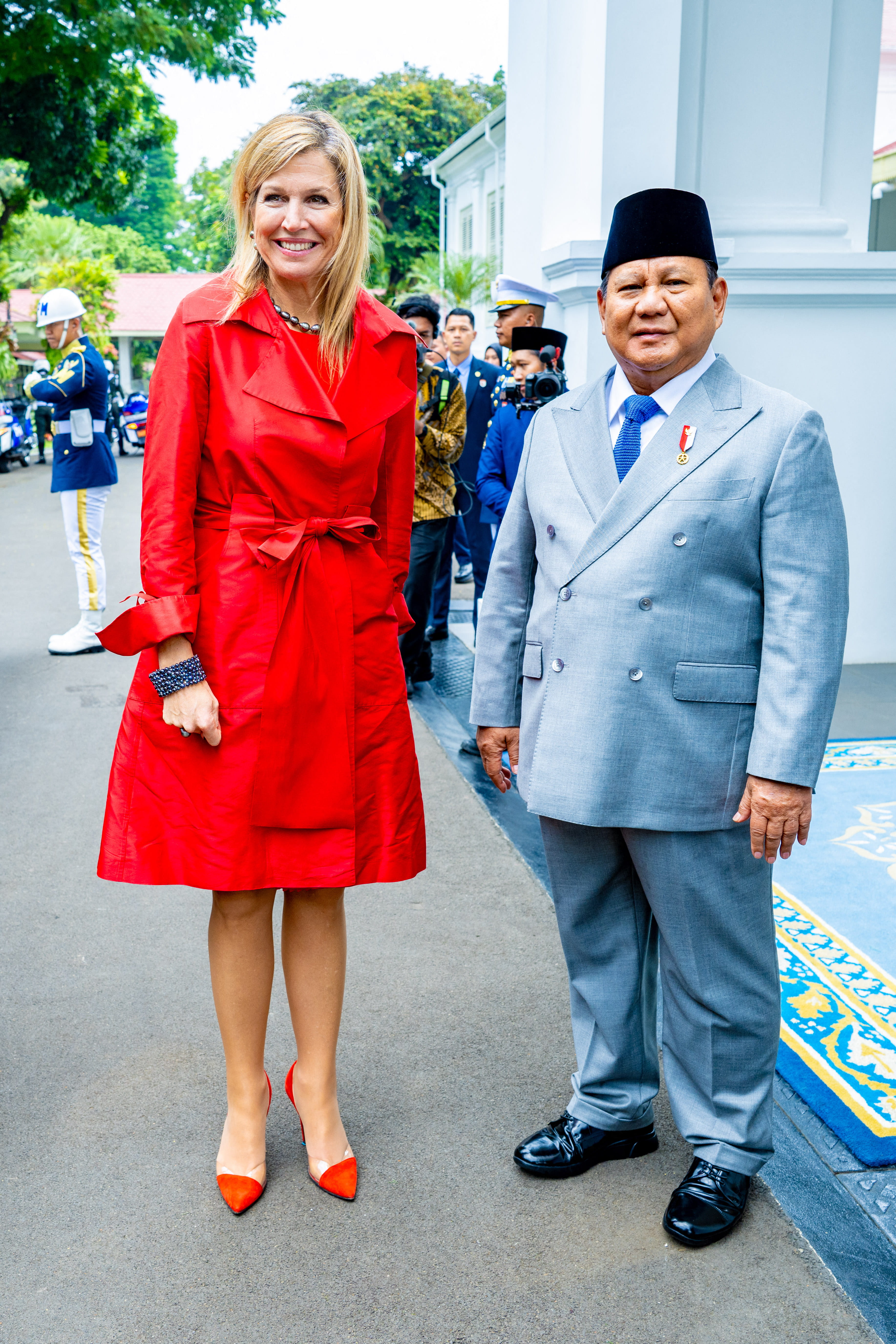 La Reine Máxima a affiché un style vibrant et audacieux centré autour d'une couleur forte, le rouge écarlate. En déplacement en Indonésie pour rencontrer le président, la reine Máxima des Pays-Bas a choisi un total look monochrome qui était tout simplement étincelant. Elle portait un trench mi-long de couleur rouge vif qui était ceinturé à la taille par une ceinture assortie, créant une silhouette élégante et marquée. L'ensemble carmin était complété par des escarpins pointus de la même teinte exactement.