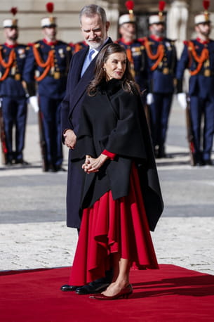 Pour accueillir le président allemand, la reine Letizia d'Espagne a mis les petits plats dans les grands en dévoilant une tenue rouge et noire particulièrement réussie. Elle portait un manteau/cape noir qui recouvrait ses épaules et le haut de son corps. Cette cape structurée, souvent synonyme d'élégance royale, était doublée et présentait un col montant en fausse fourrure. Dessous, on pouvait apercevoir une robe d'un rouge écarlate intense. La jupe était caractérisée par un volume spectaculaire grâce à un jeu de plis et de volants qui donnait du mouvement à sa tenue. Contrairement à l'attendu, elle portait des ballerines plates, privilégiant le confort pour cette occasion.