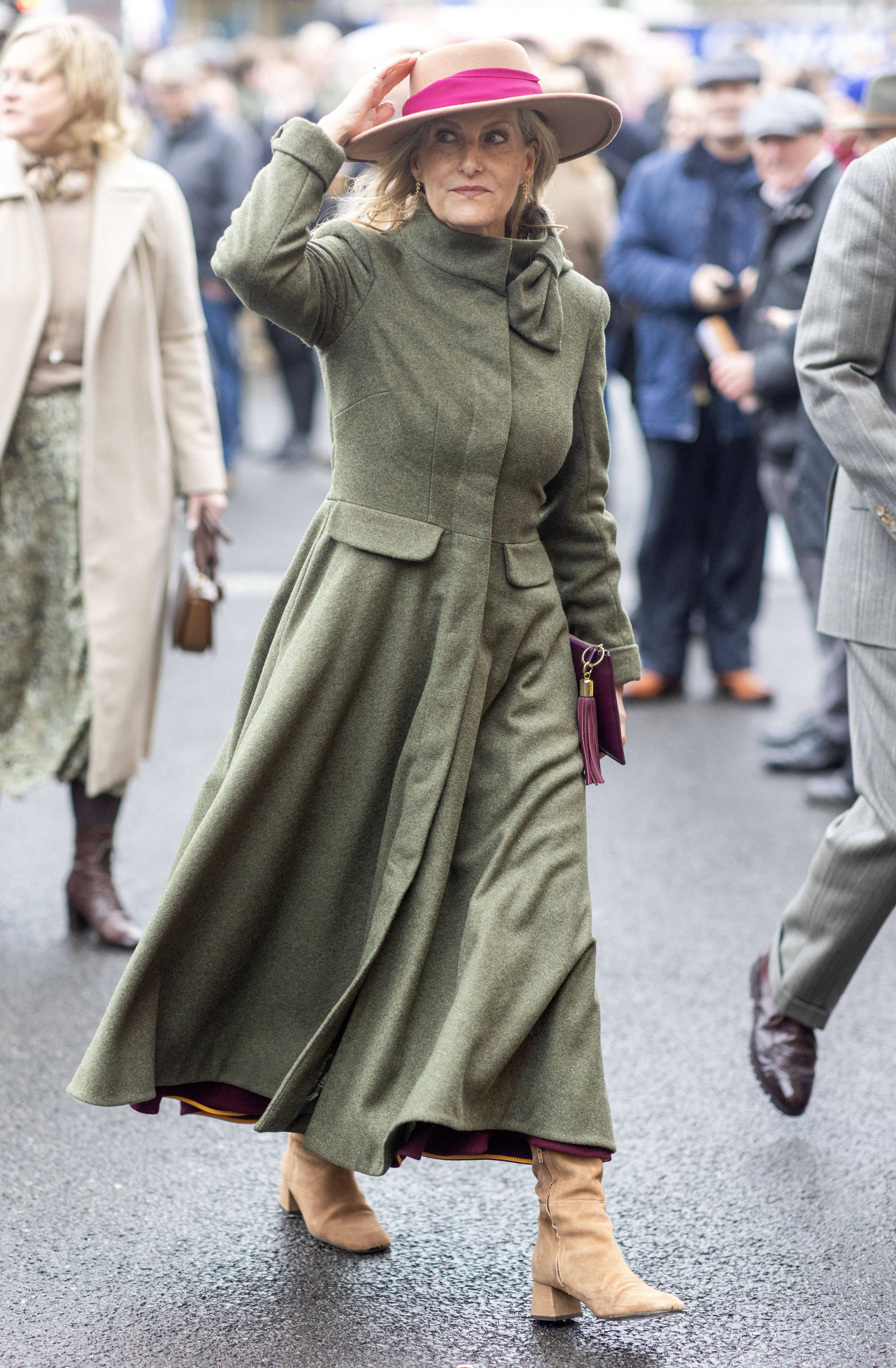 Pour assister à la Coral Gold Cup sous la pluie, Sophie d'Édimbourg a révélé une tenue campagne chic et élégante, typique du style britannique. Elle portait une robe manteau en tweed signée Claire Mischevani de couleur vert kaki qui disposait d'une coupe évasée, très structurée et ajustée à la taille, évoquant un style militaire. Le col montant était rehaussé d'un nœud discret et d'un col haut. Elle était coiffée d'un chapeau feutré de style fedora de couleur camel/beige orné d'un ruban rose fuchsia. Le tout complété par des bottines en daim camel.