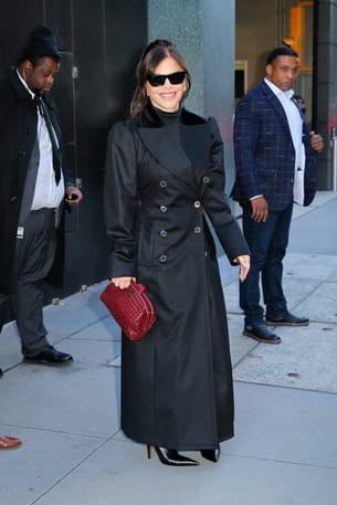À New York, Lauren Sánchez a incarné le chic absolu dans un total look noir. Elle a opté pour un manteau extra-long qui s'est imposé comme la pièce maîtresse, un modèle structuré et croisé aux épaules. Le monochrome sombre était subtilement brisé par un accessoire clé : une pochette luxueuse de couleur bordeaux. Les lunettes de soleil noires, larges et enveloppantes, ajoutaient une note de glamour mystérieux, tandis que les escarpins noirs à bout très pointu ont ancré ce look dans une féminité intemporelle.