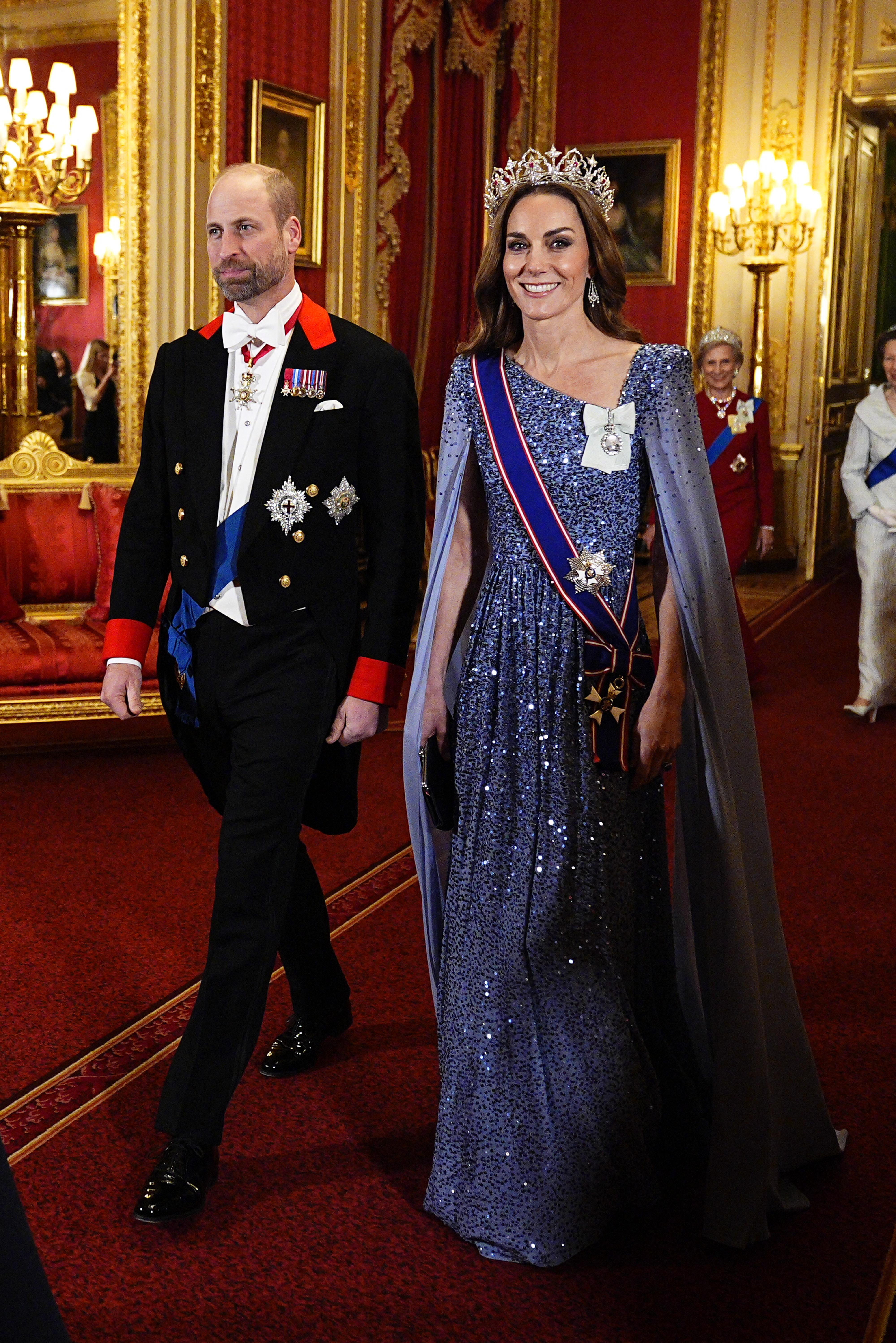 Avant le banquet d'État donné en l'honneur du président allemand, Kate Middleton a fait une apparition exceptionnelle dans une tenue incroyable. Elle a choisi une robe de bal éblouissante, taillée dans un tissu bleu-mauve intense, entièrement brodé de paillettes scintillantes qui captaient la lumière tel un ciel étoilé. Sa silhouette était magnifiée par une cape vaporeuse de mousseline assortie, lui conférant une allure majestueuse. Évidemment, ce tableau était complété par les joyaux de la Couronne : un diadème somptueux.