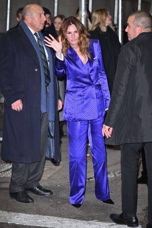 Aux Gotham Awards à New York, Julia Roberts a fait une apparition audacieuse et électrisante en adoptant un tailleur-pantalon d'une couleur d'une intensité rare : un violet vibrant et profond. Son costume était confectionné dans une matière satinée qui captait la lumière et dans un motif à pois ultra tendance. Pour accompagner cette pièce originale, elle a choisi d'adopter des bijoux discrets avec notamment des colliers multicolores autour de son cou. Il s'agissait d'ailleurs de deux pièces issues de la collection Figlia dei Fiori en or rose 18 carats de Pasquale Bruni.