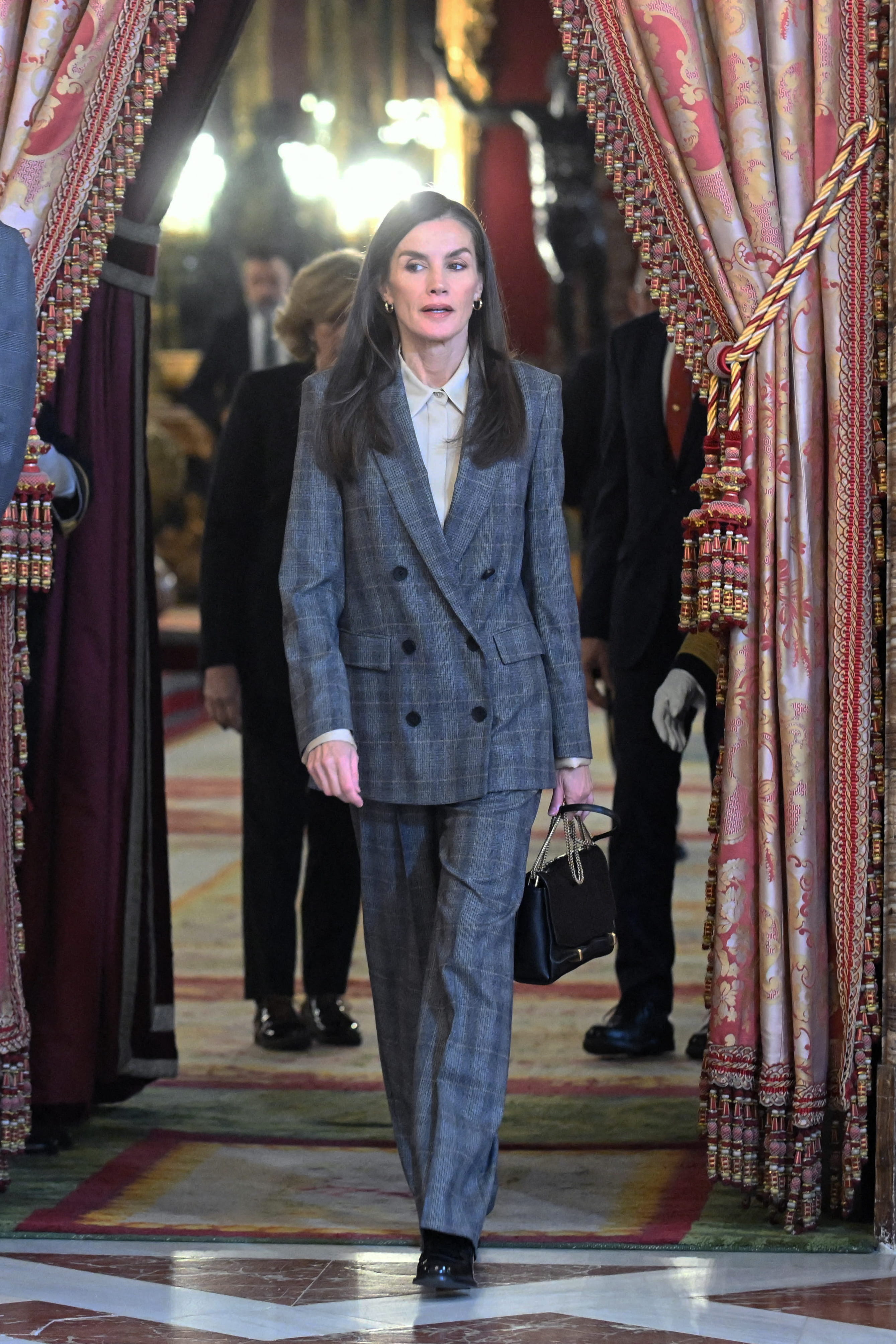 Le 4 décembre dernier à Madrid, Letizia d'Espagne a participé au conseil d'administration de la Fondation Princesse de Gérone. L'occasion pour la reine de porter un tailleur-pantalon à carreaux gris, à la coupe masculine et parfaitement ajustée. La veste croisée structurait sa silhouette et apportait une touche d'élégance tandis que son pantalon élançait ses jambes. Sous le costume, une chemise claire adoucissait l'ensemble. Pour le côté formel, la souveraine a opté pour des chaussures noires vernies et un sac noir à chaîne dorée.
