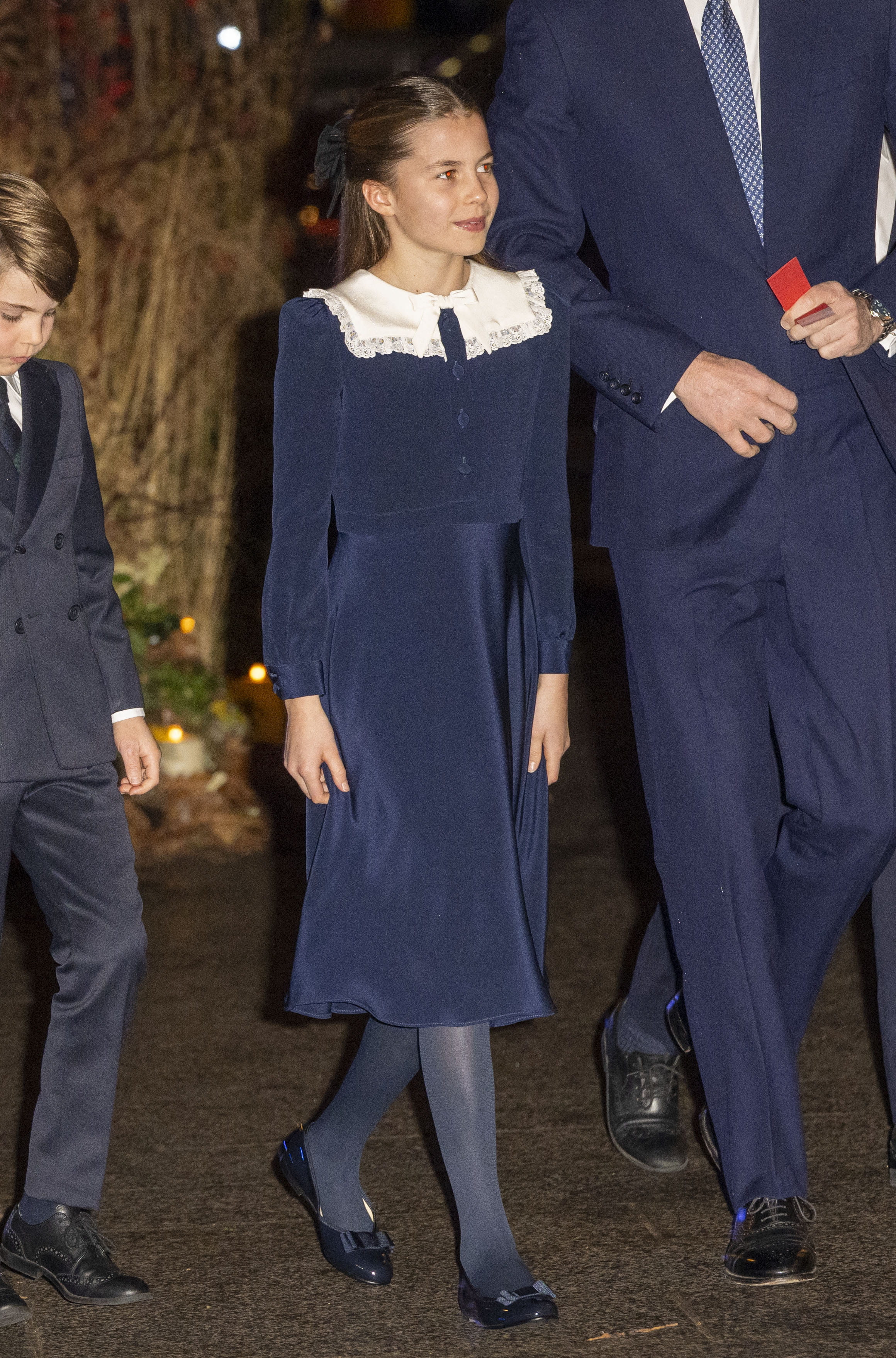 Lors du concert Together at Christmas du 5 décembre, la princesse Charlotte a fait l'unanimité avec cette robe de cérémonie bleu marine à manches longues, rehaussée d'un grand col Claudine en dentelle, qui contrastait joliment avec le tissu sombre. La robe, mi-longue, était associée à des collants bleus assortis. Aux pieds, elle portait des ballerines vernies foncées décorées d'un nœud. Sa coiffure semi-attachée à l'aide d'un nœud était toute simple. Elle complétait ce look traditionnel à la perfection.