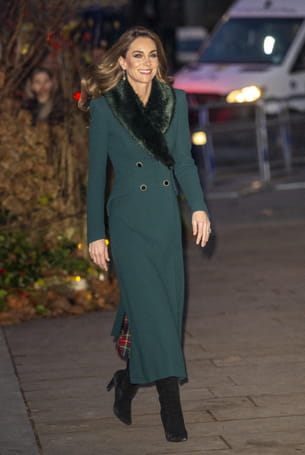 Kate Middleton était rayonnante lors du concert de chants de Noël à Londres, le 5 décembre dernier. La princesse de Galles a choisi un look sophistiqué et de saison, dominé par un long manteau-robe ajusté de couleur vert forêt. Le manteau se caractérisait par son col châle en fausse fourrure et ses boutons noirs disposés en double boutonnage. La coupe cintrée et structurée du manteau mettait en valeur sa silhouette. Elle portait des bottes hautes en daim noir à talon, qui se mariaient parfaitement avec le côté classique de sa tenue. Un look hivernal et festif parfaitement maitrisé.