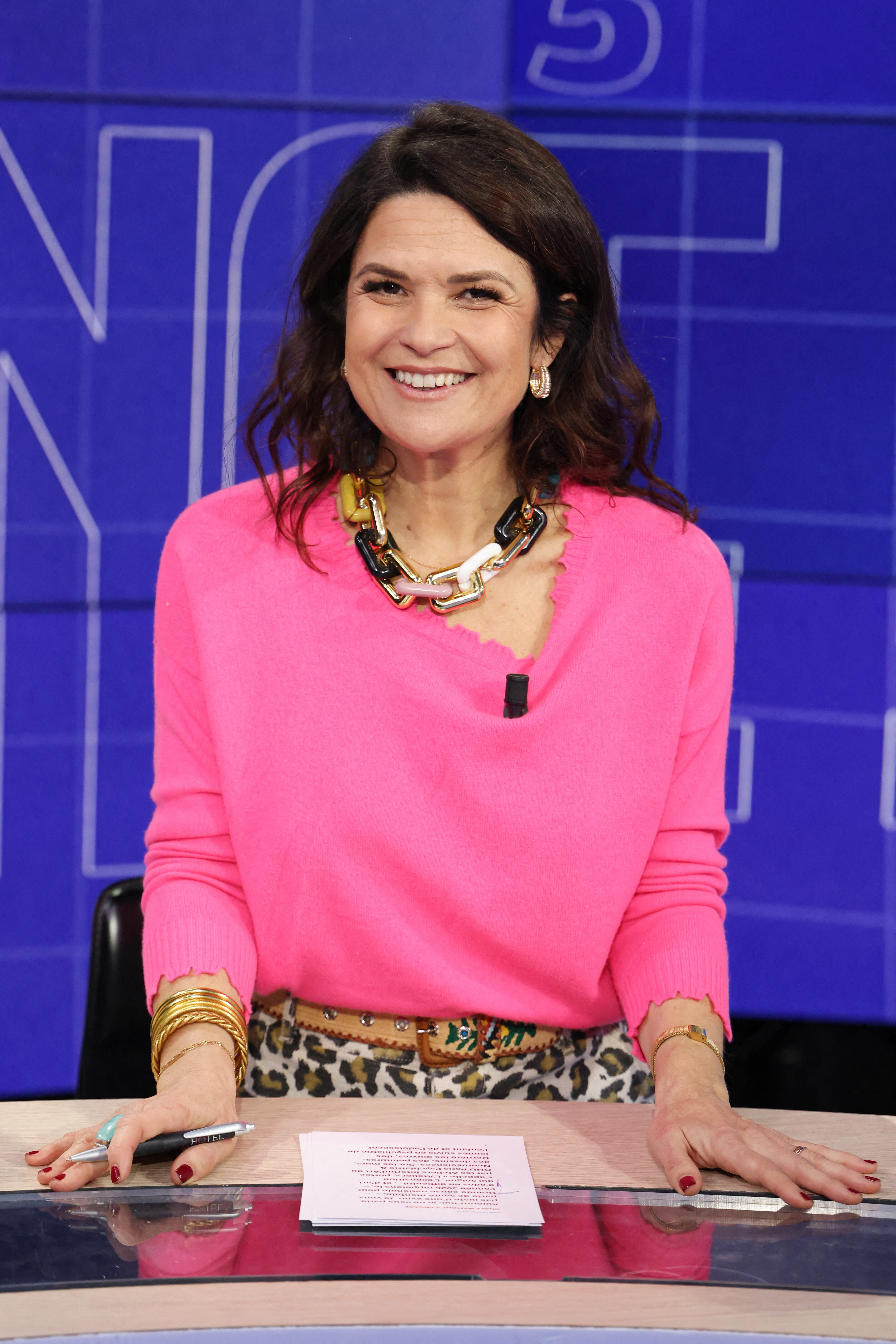 Julie Mamou-Mani propose ici un look coloré et tendance sur le plateau de RMC. Elle mise sur une tenue color-block audacieuse avec un pull en maille rose néon, dont l'encolure déstructurée apporte une touche de modernité. Le clou du spectacle réside dans l'accumulation d'accessoires de caractère et un mix d'imprimés : elle ose le pantalon léopard, créant un contraste sauvage et chic avec le rose vif. Enfin, une accumulation de joncs aux poignets et des créoles texturées viennent parfaire cette silhouette joyeuse et assumée.