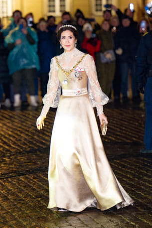 Lors du banquet du Nouvel An au palais d'Amalienborg, la reine Mary du Danemark a ébloui l'assistance avec une robe de soirée royale. Cette pièce majestueuse se distinguait par un bustier cintré et une jupe fluide en satin signée Jesper Høvring, complétée par un haut en dentelle délicate à col montant et manches bouffantes. Elle arborait avec prestance les insignes de l'Ordre de l'Éléphant, portés sur une imposante chaîne en or. Pour couronner cet ensemble, elle portait un diadème de diamants étincelant, assorti à des boucles d'oreilles pendantes.