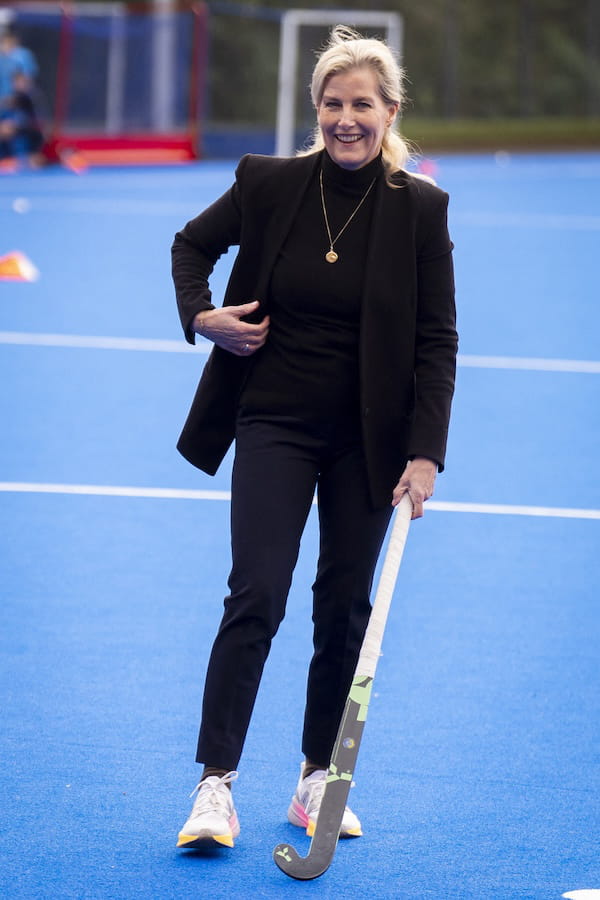 Sophie d'Edimbourg a repris ses fonctions royales, le 12 janvier dernier, en participant à un entraînement de hockey sur gazon. Celle qui a fait des robes à fleurs sa marque de fabrique est apparue pour l'occasion avec un style qui change. Elle arborait un total look noir comprenant un col roulé avec un collier à pendentif en or par-dessus, un pantalon fuselé et une veste de blazer à la coupe cintrée. Mais le plus surprenant était de voir la duchesse porter des baskets blanches à la semelle multicolore aux pieds…