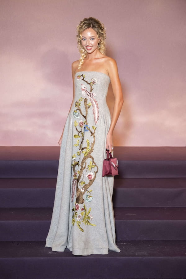 De nombreuses célébrités se sont pressées au palais Brongniart, le 14 janvier dernier, pour assister à l'avant-première mondiale de Bridgerton. Parmi elles, Maria Chiara de Bourbon a honoré le thème de la série en glissant sa silhouette dans une robe bustier de la maison de couture Alberta Ferretti. La pièce, confectionnée en laine grise, se distinguait par des broderies multicolores au style japonais. Un sac à main en satin bordeaux et des boucles d'oreilles en forme de cage à oiseaux terminaient le look de la fille du duc de Castro.