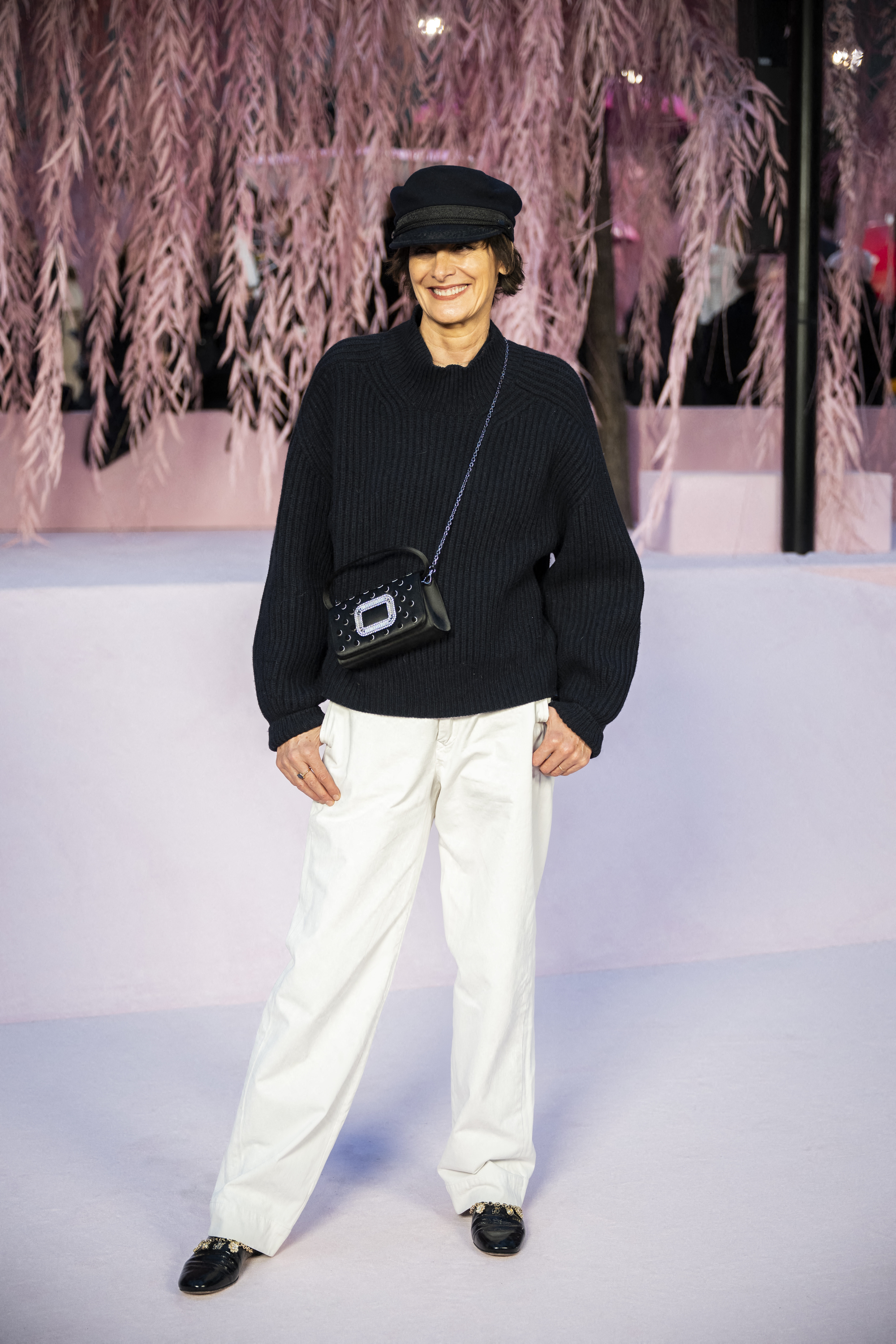 Inès de la Fressange, l'éternelle égérie du chic parisien, nous livre une nouvelle leçon de style avec cette allure "effortless" dont elle seule a le secret. Elle ose le mix parfait entre décontraction et sophistication en associant un pull en maille à un pantalon large blanc immaculé. Ce duo intemporel et frais, est dynamisé par des accessoires de caractère : une casquette gavroche pour la touche boyish et un sac à boucle scintillante porté en bandoulière. Ses mocassins bijoux scellent cette silhouette avec panache.