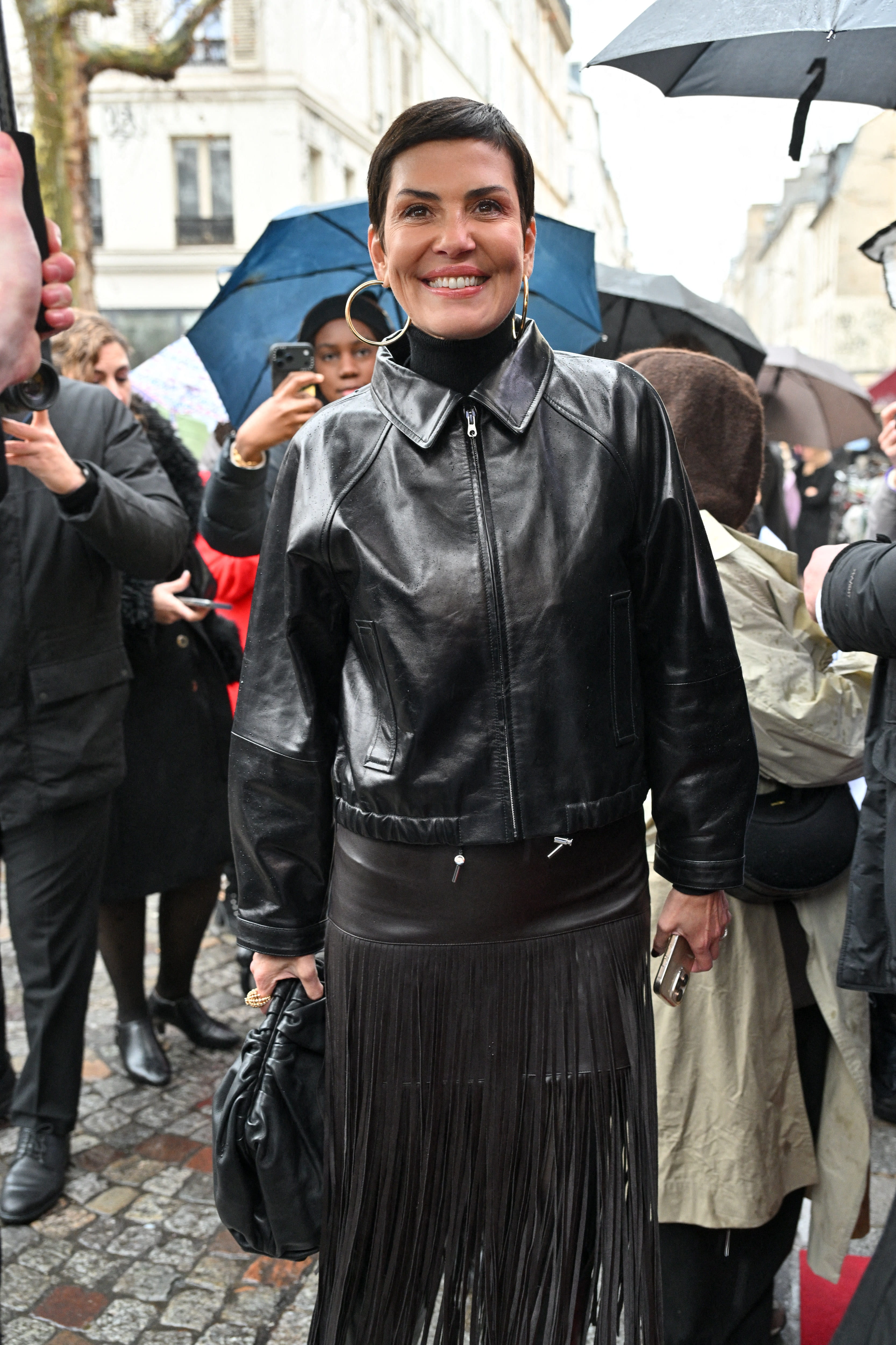 Cristina Cordula, la papesse du style, nous livre une véritable leçon de mode en plein cœur de Paris. Elle ose le total look cuir noir, jouant sur des contrastes de textures : un blouson zippé à la coupe impeccable surmonte une jupe longue à franges spectaculaires, qui apporte un mouvement hypnotique à sa silhouette. Pour parfaire cette allure, elle mise sur des créoles dorées XXL, sa signature incontestée, et une pochette souple coordonnée. Avec sa coupe courte iconique et son sourire radieux, elle prouve que le noir est tout sauf ennuyeux lorsqu'il est porté avec une telle audace. Magnifaïk !