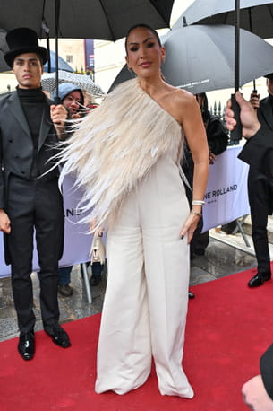 Vitaa s'approprie les codes de la haute couture avec une aisance digne des plus grands défilés. Elle irradie dans une combinaison ivoire asymétrique ornée d'un spectaculaire plastron de plumes qui balaie son buste apportant une dimension onirique à ce look monochrome. En misant sur un pantalon extra-large à la coupe impeccable, elle allonge parfaitement sa silhouette. Son chignon haut et son maquillage solaire complètent cette allure de déesse moderne. Un sans-faute audacieux à l'image de la star.