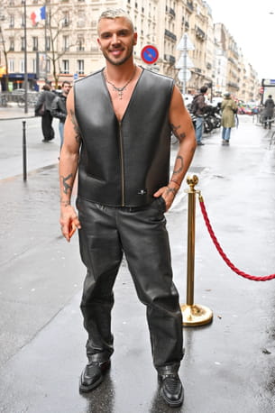 Jonathan Jenvrin bouscule les codes du vestiaire masculin avec une allure qui ne laisse personne indifférent. Il arbore ici un total look en cuir noir à la texture grainée, mixant avec brio esprit rock et minimalisme urbain. La pièce maîtresse ? Un gilet zippé sans manches porté à même la peau, qui souligne une carrure athlétique et laisse entrevoir ses nombreux tatouages. Le pantalon large assorti apporte du volume à sa silhouette tandis que ses baskets massives et ses colliers en argent peaufinent ce look à la fois brut et ultra-pointu.